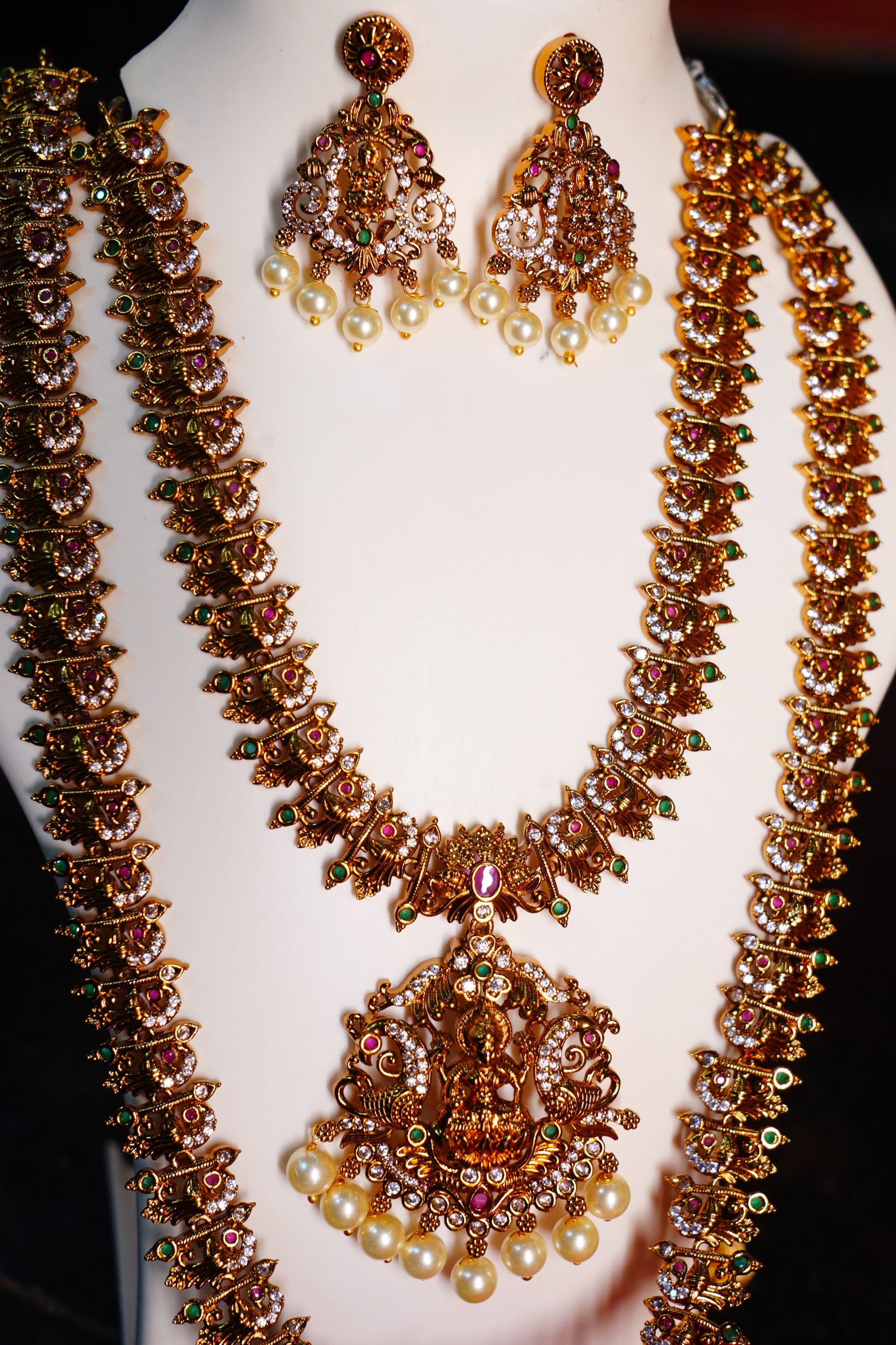 Name : Premium Matte Finish South Indian Temple Jewellery Combo Set for Women with Long and Short Necklace & Earrings